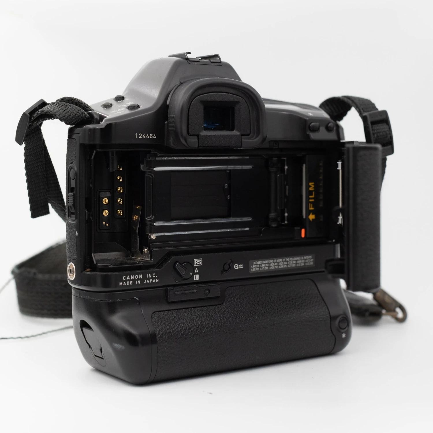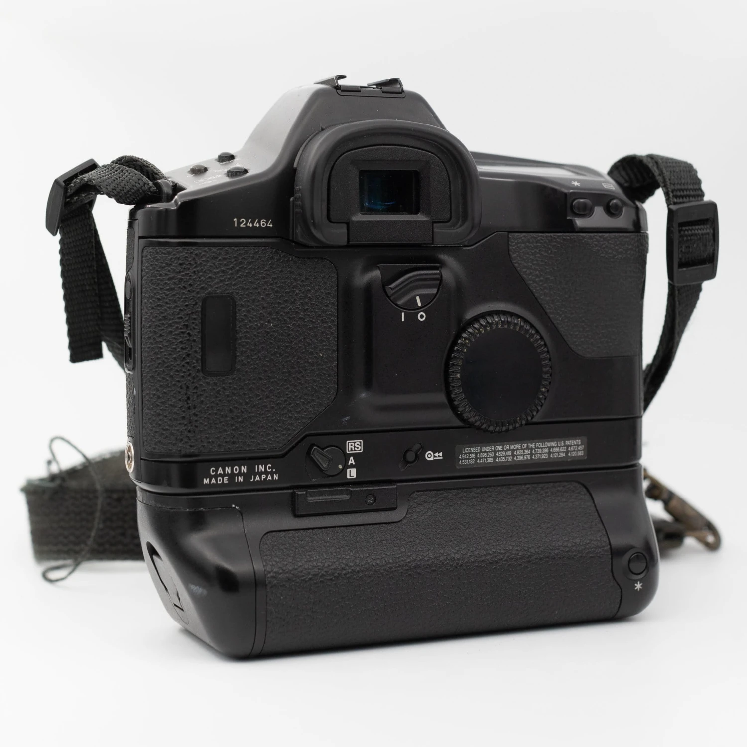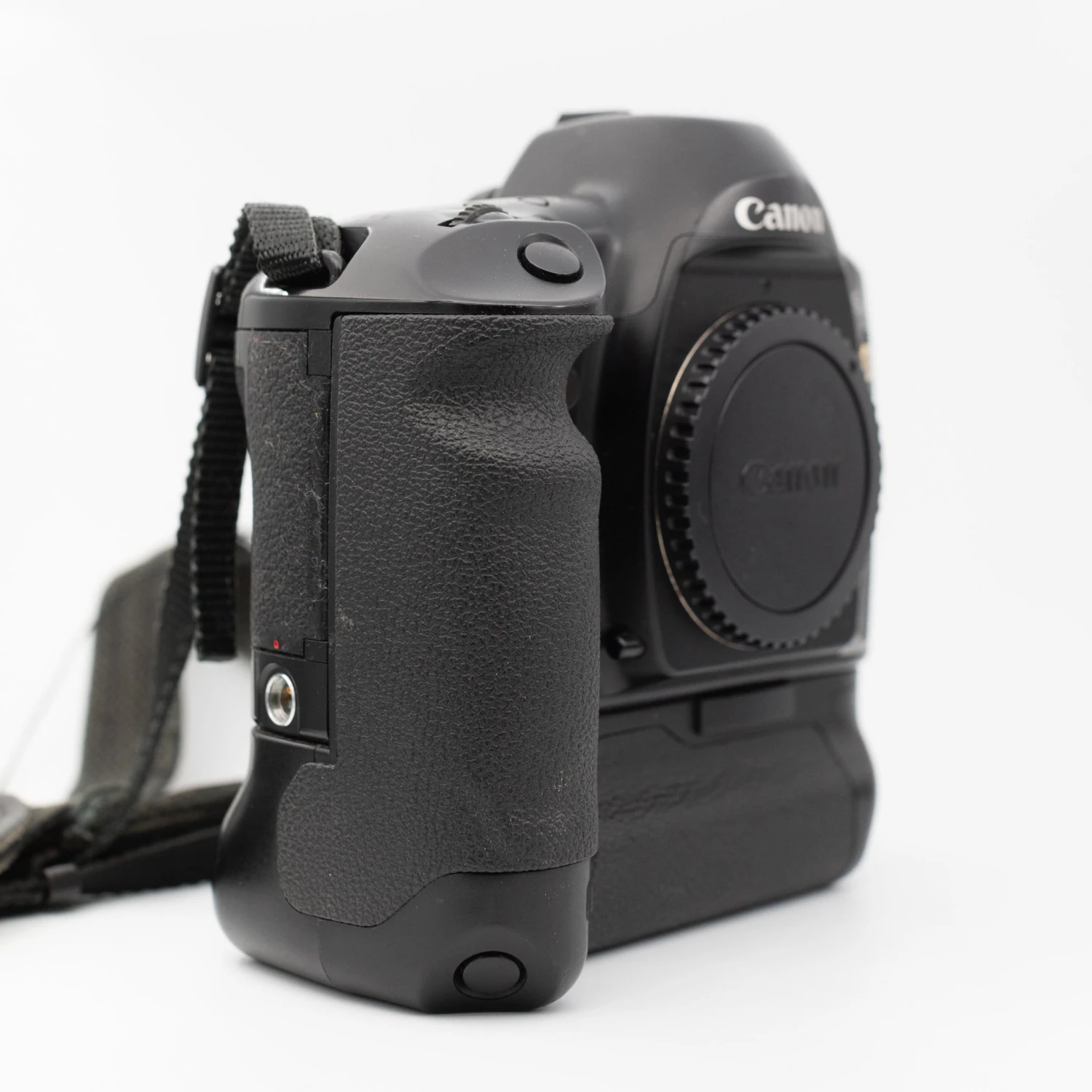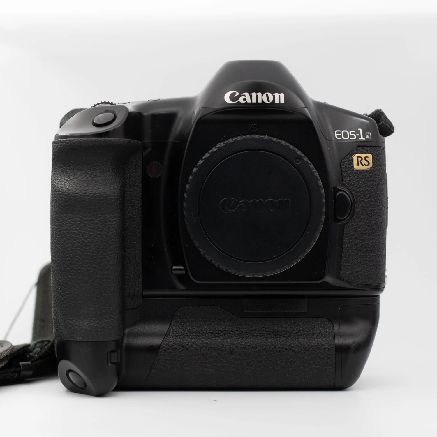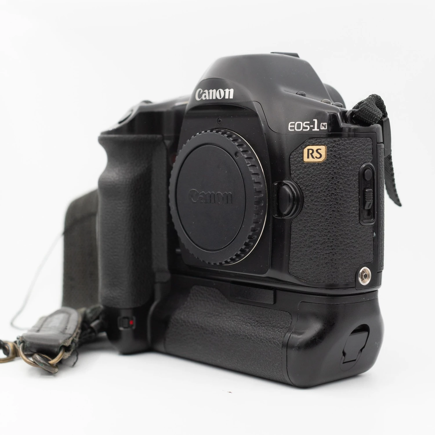 The Canon EOS-1N RS was based on the EOS-1N, but it solves the problem of needing a very fast mirror return for high-speed shutter speeds by not moving the mirror at all. This camera has a pellicle mirror, which remains stationary while shooting. This mirror both reflects some light (up into the prism and viewfinder) and allows other light to pass through (hitting the film plane). When this camera was released in 1995, it was the world’s fastest 35mm AF SLR, with a continuous shooting speed of 10 fps in RS (CH) mode. In most other specs, this camera is identical to the EOS-1N.