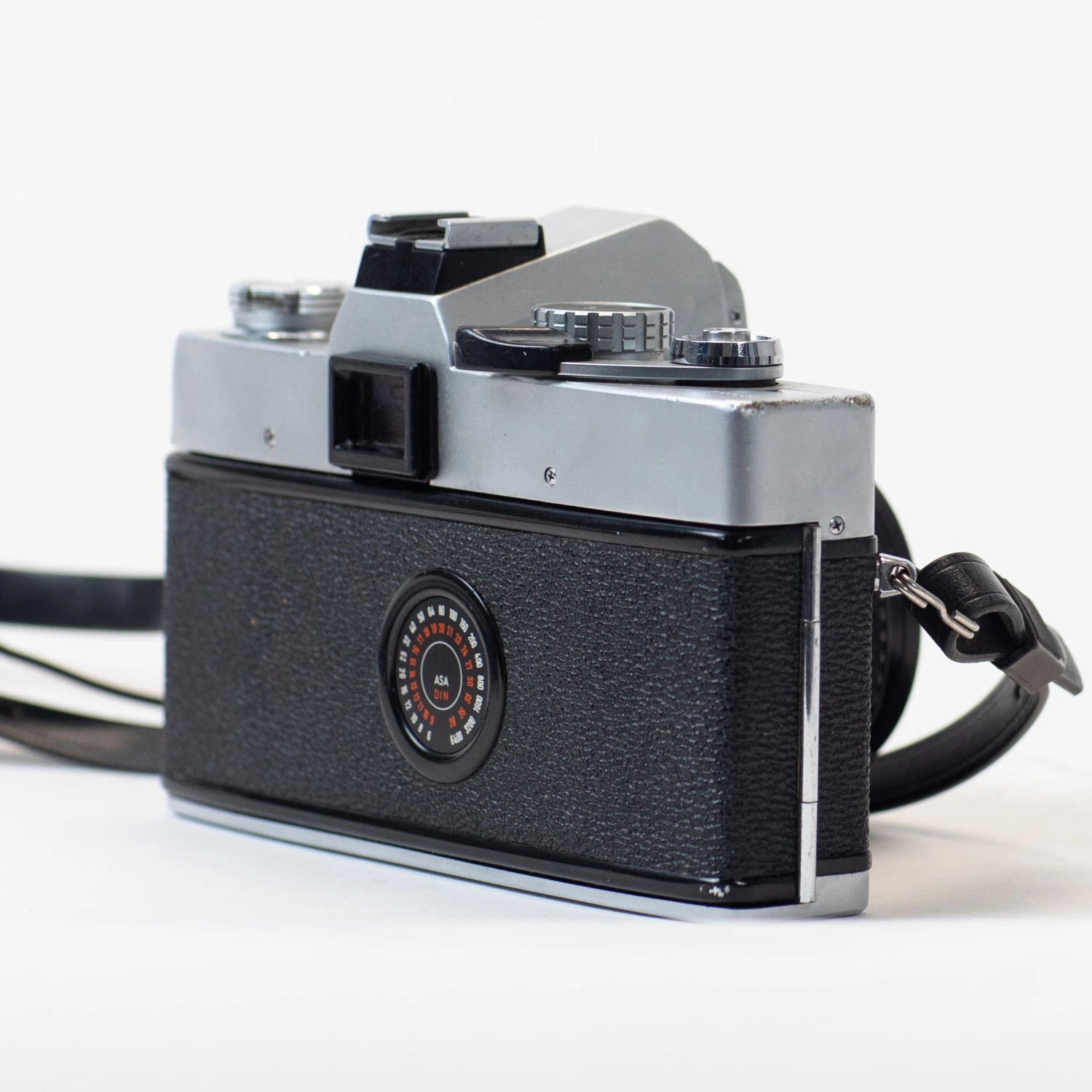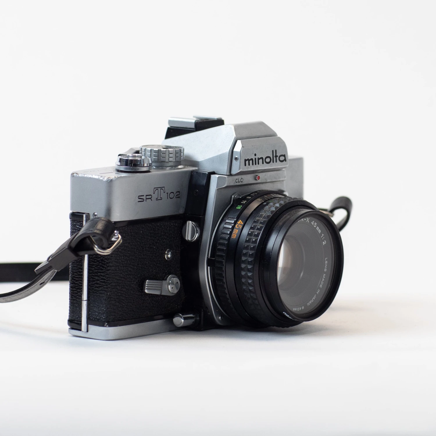 The Minolta SRT102 is a 35mm manual-focus SLR with through-the-lens (TTL) metering and manual exposure. This camera body is paired with a Rokkor-X 45mm f/2 lens. At 45mm, this lens is a touch wider than the standard 50mm angle of view, and comes from the sought-after Rokkor-X family.
