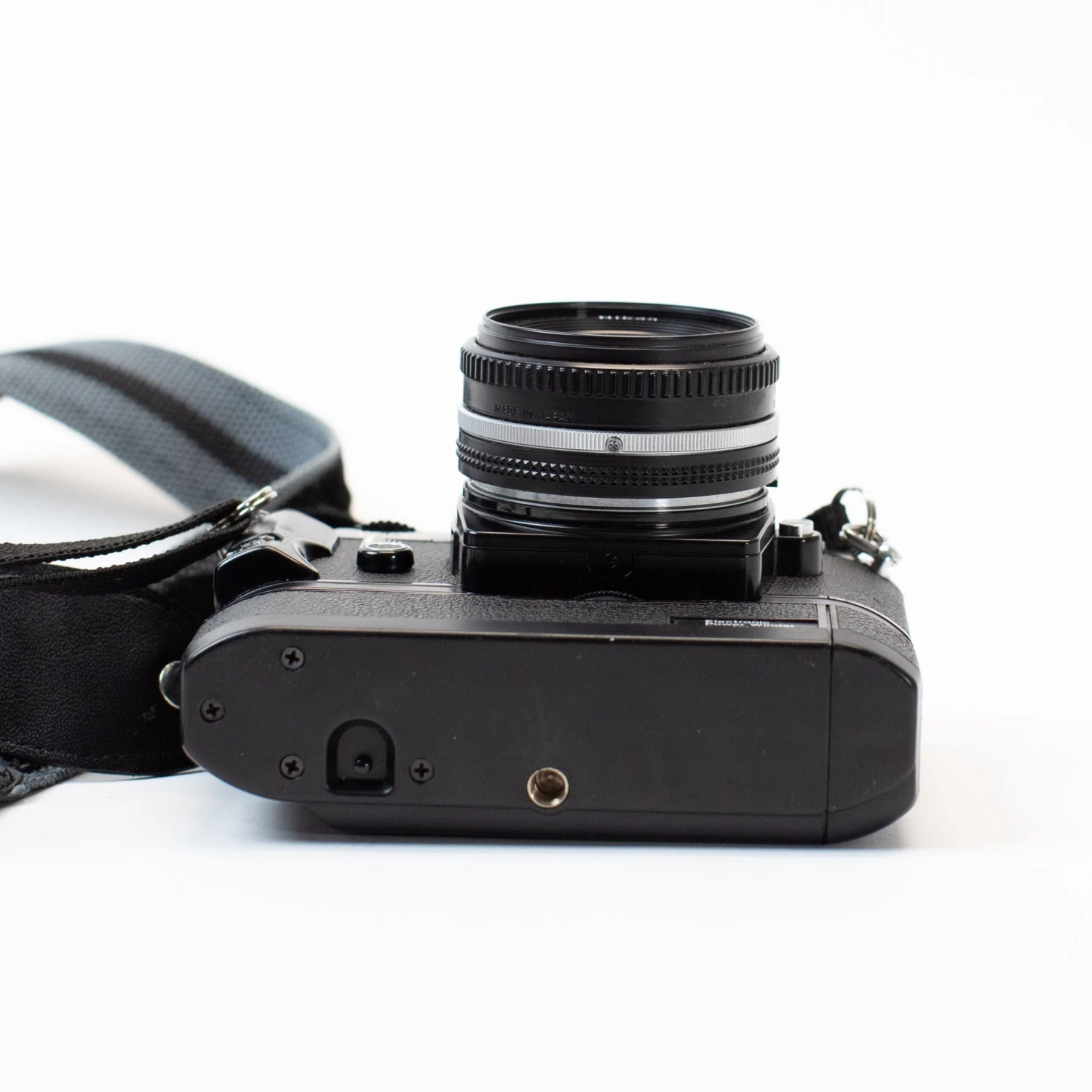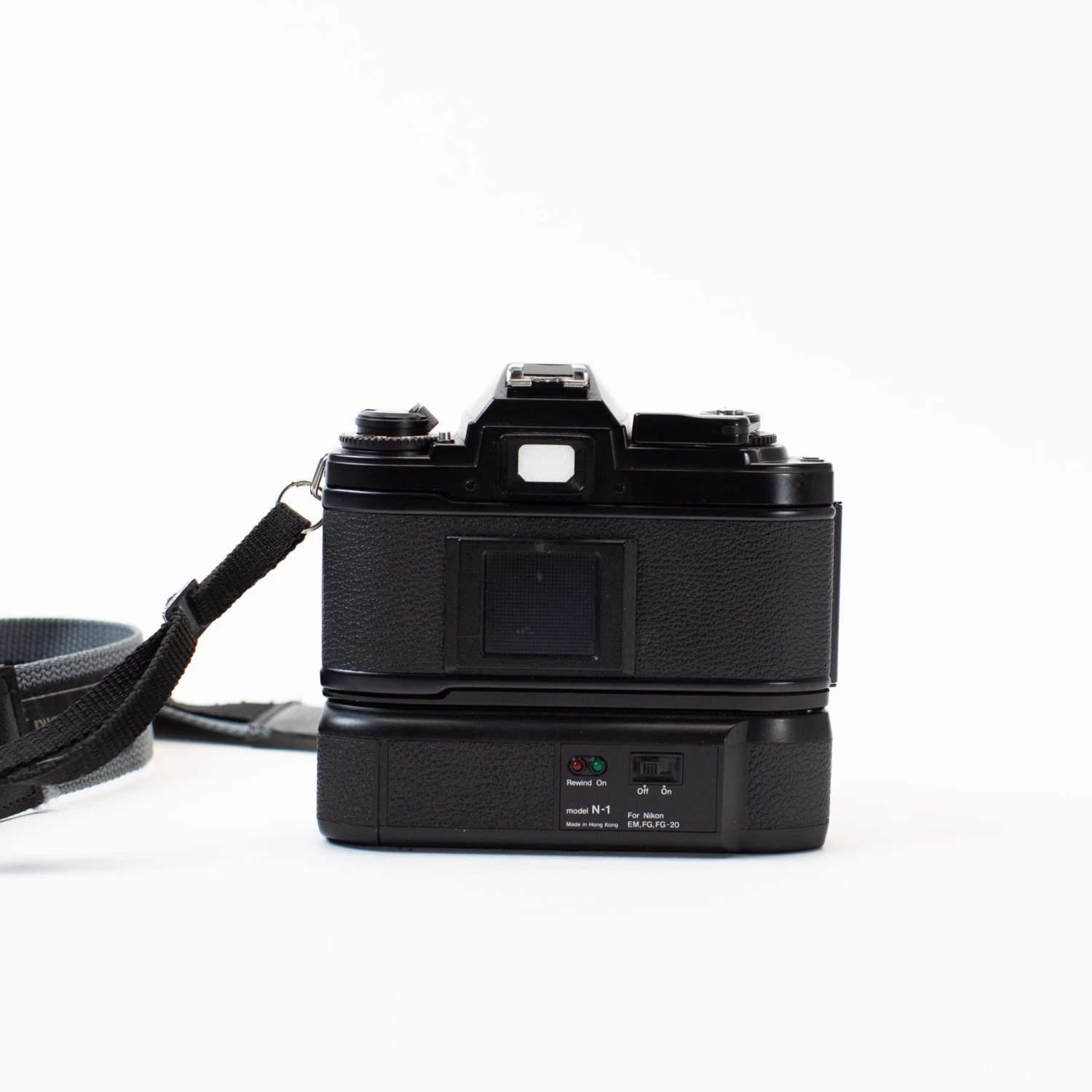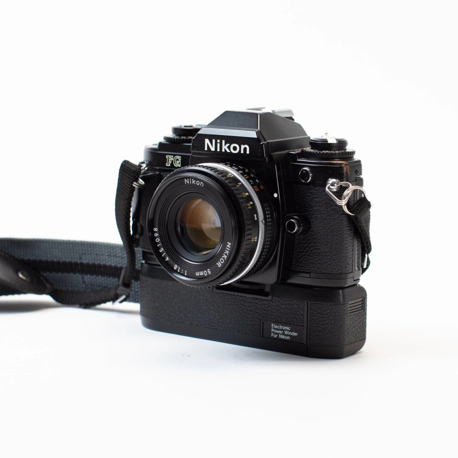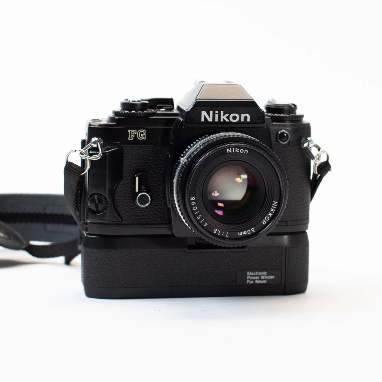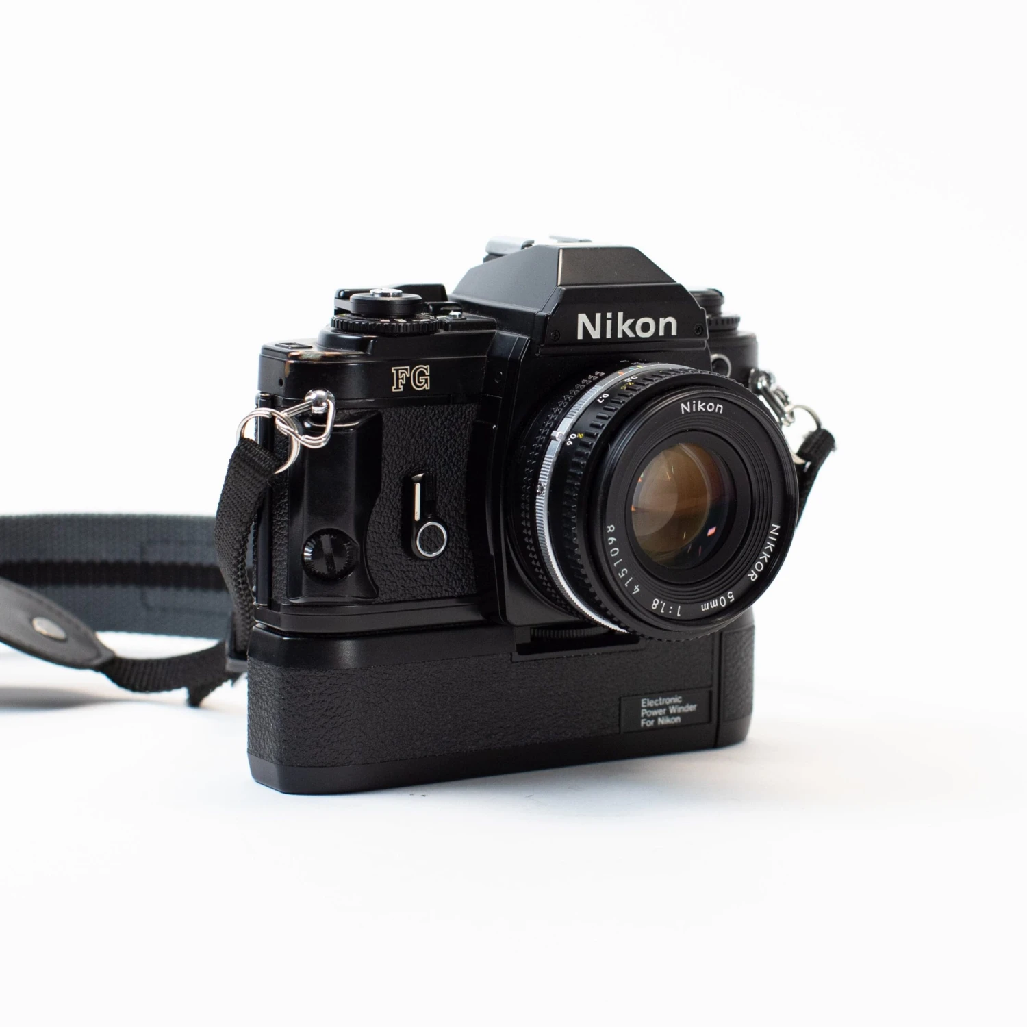 The Nikon FG is a 1980s SLR with Program, Aperture Priority, and full Manual exposure modes. It was one of Nikon’s compact offerings, meaning this is a smaller body than others in the Nikon lineup. This one comes with a power winder attached — see our YouTube video at the bottom of this listing to learn more.
