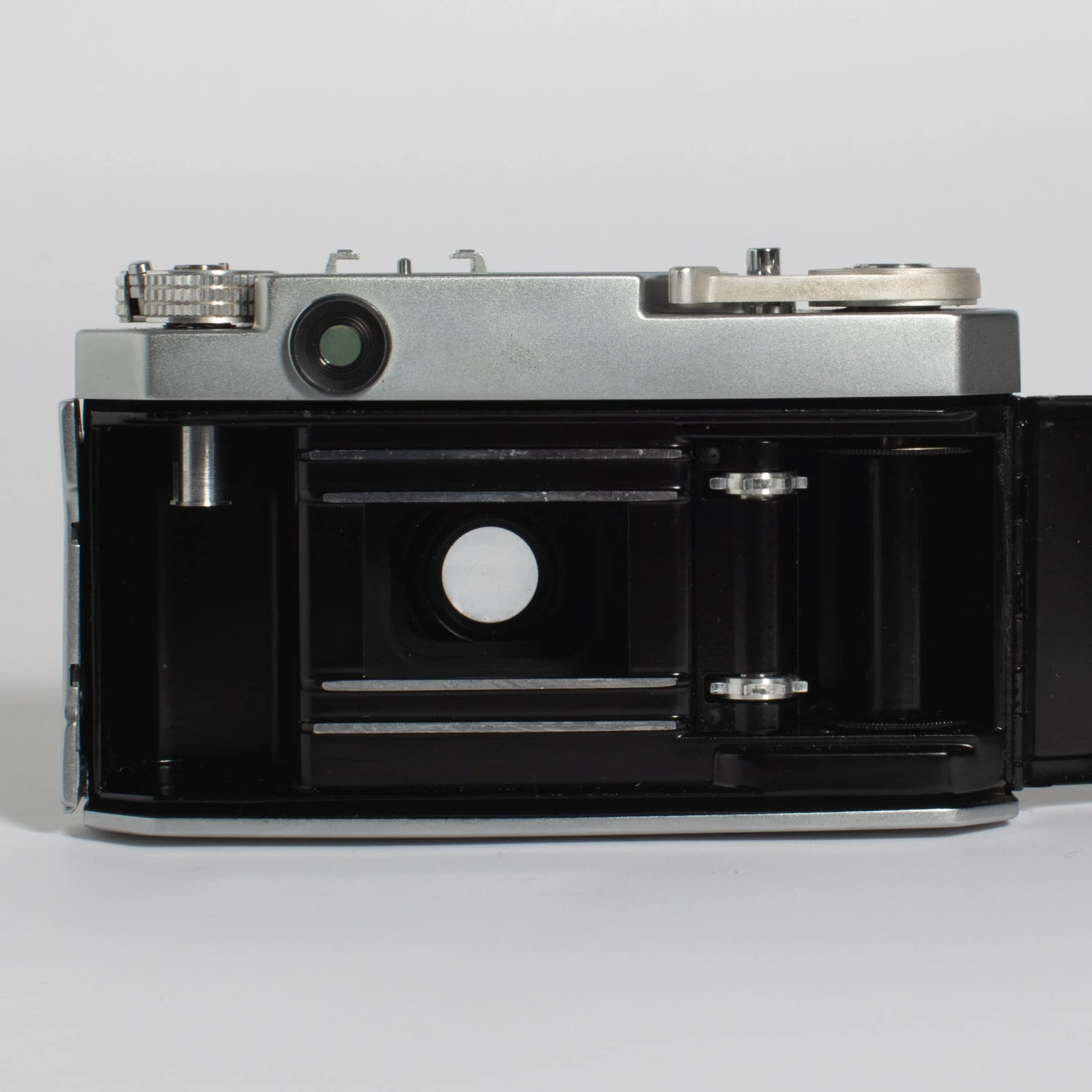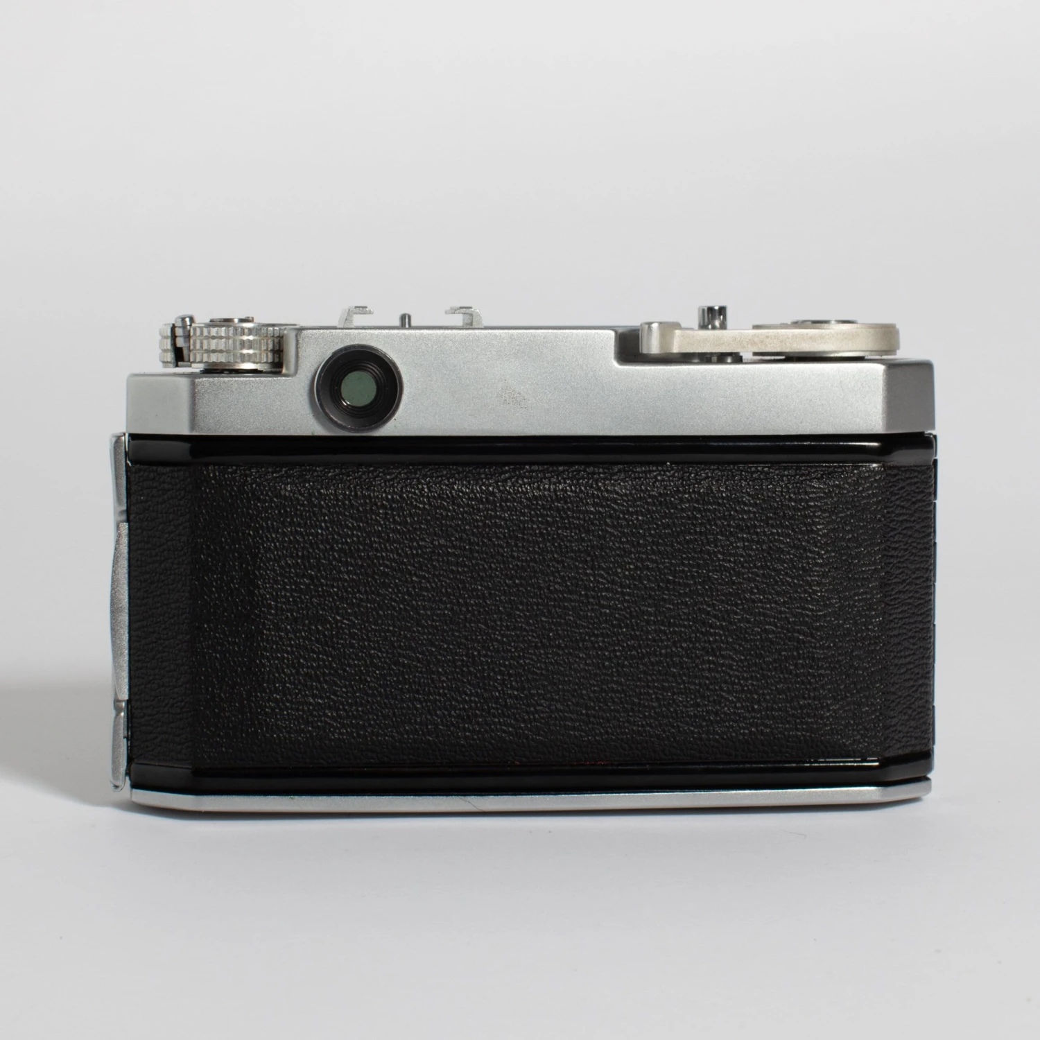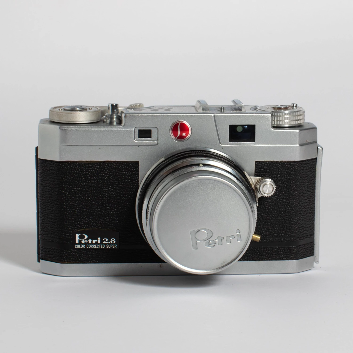 The models above were replaced with the Petri 2.8 Color Super (1958), Petri 1.8 Color Super (1959), and Petri 1.9 Color Super (1960) (these cameras are called ‘Color Super’ by McKeown, and elsewhere, but no Petri document has yet been seen using this name). All have a bright-line frame in the viewfinder, with parallax correction. This is illuminated via a green glass window in the front of the top housing, which also covers the rangefinder window (once again, the specification must have been changed; McKeown shows an example of the f/1.9 camera in which only the bright-line panel is covered with green glass, not the RF spot). The styling of the three models is very similar, whereas, in the preceding series, the model with the faster lens was more generally better-specified.