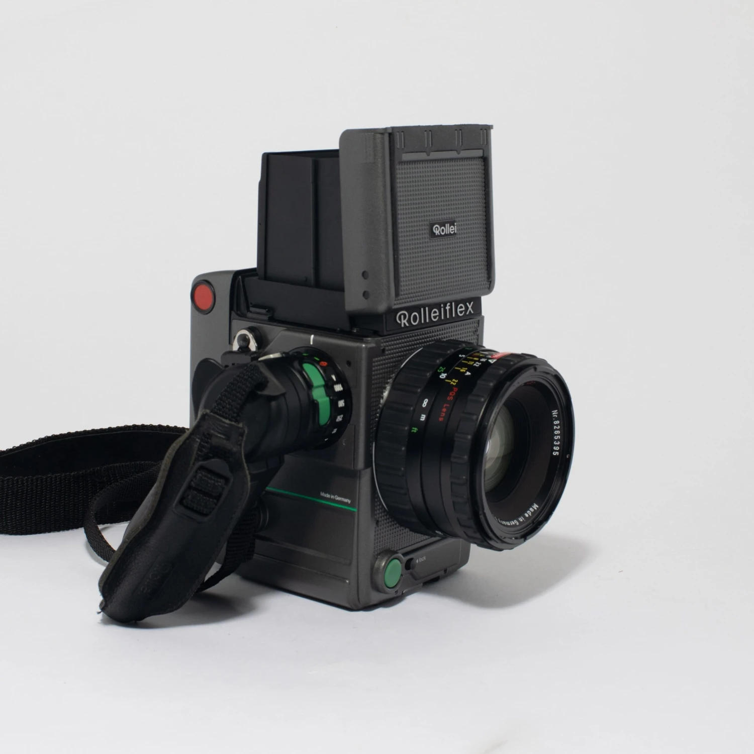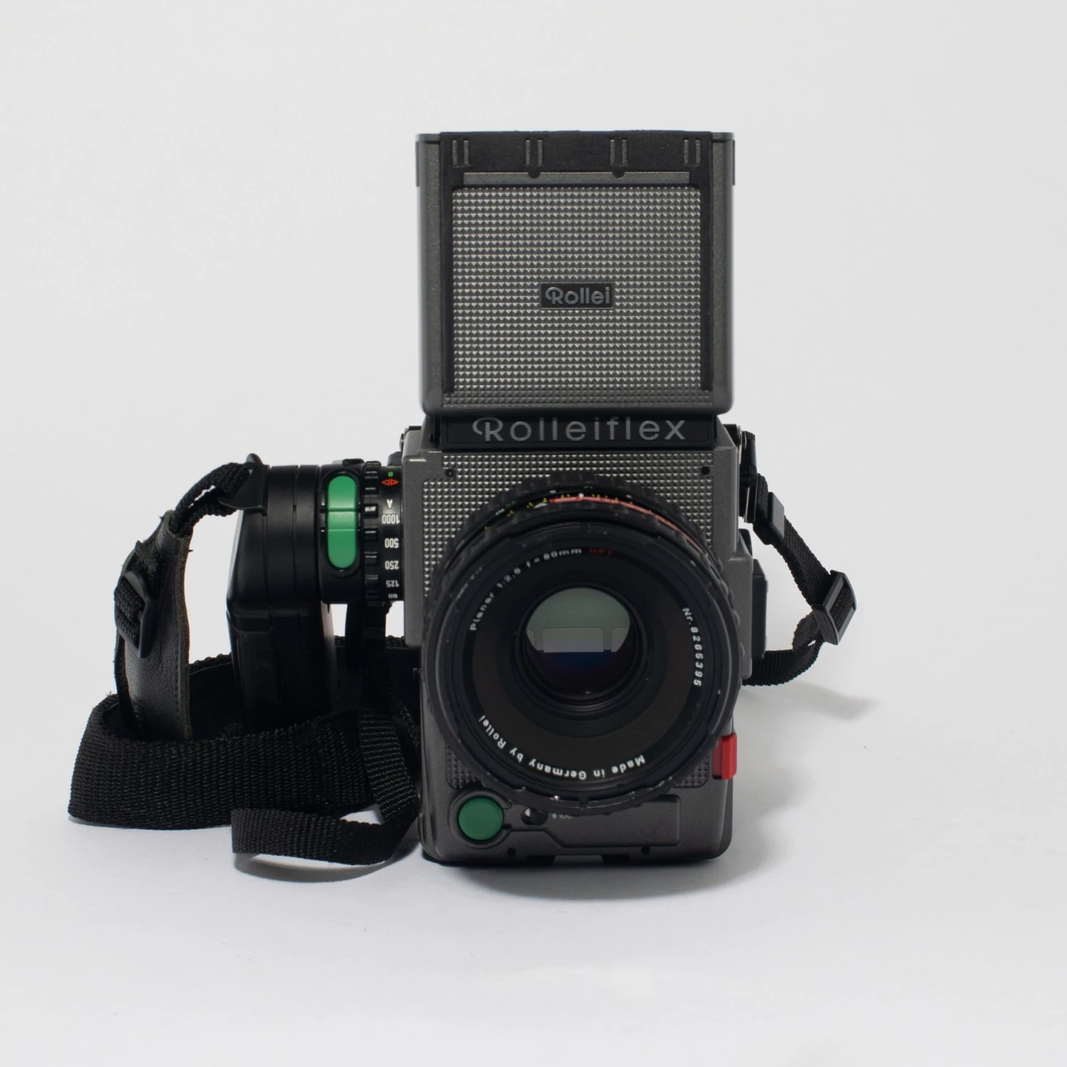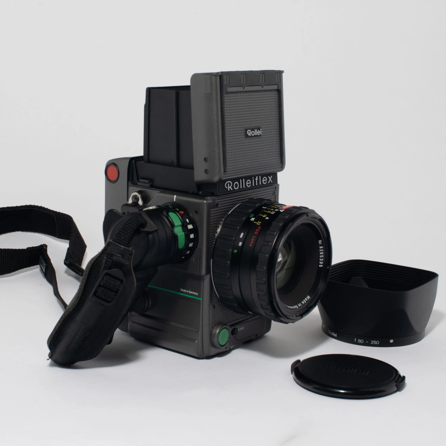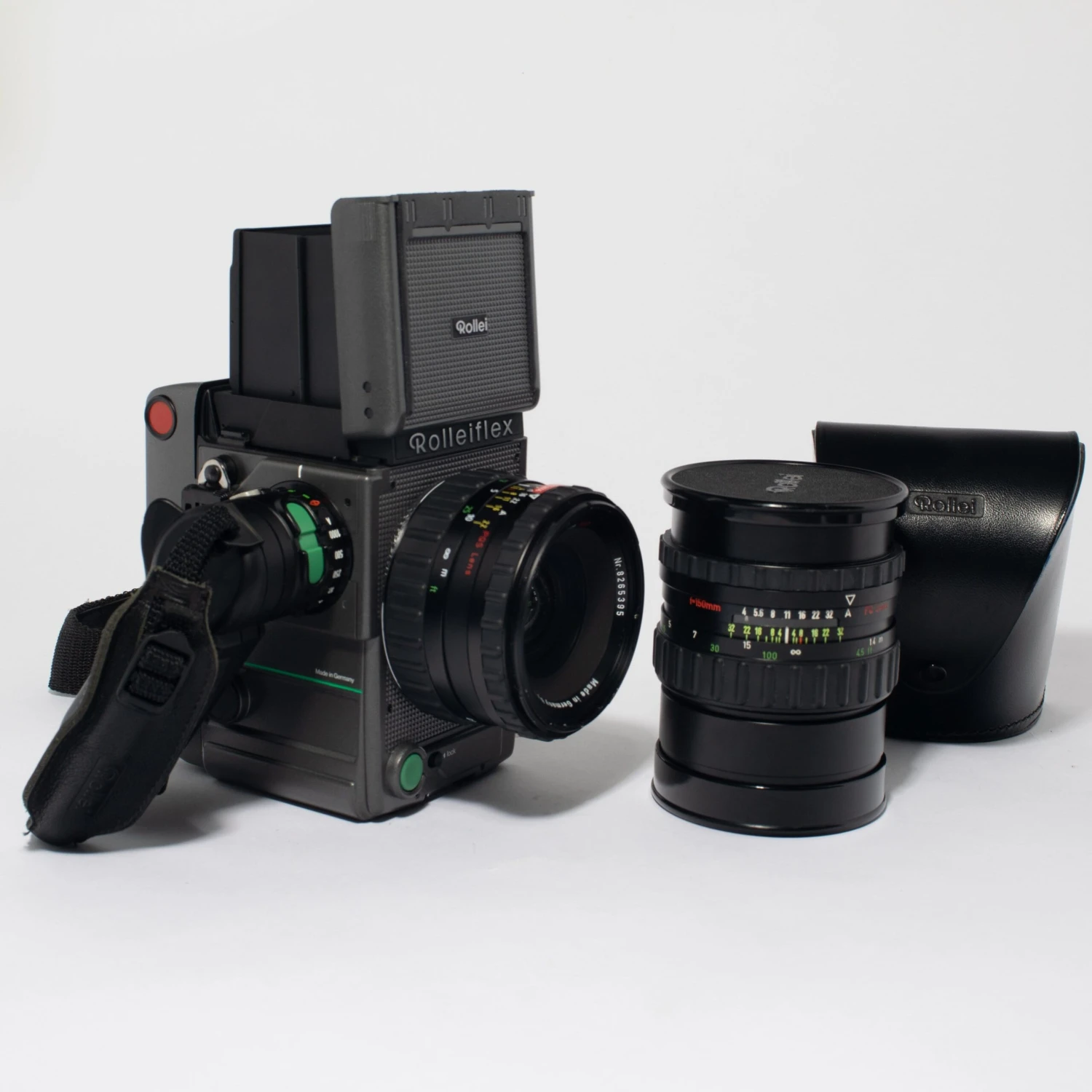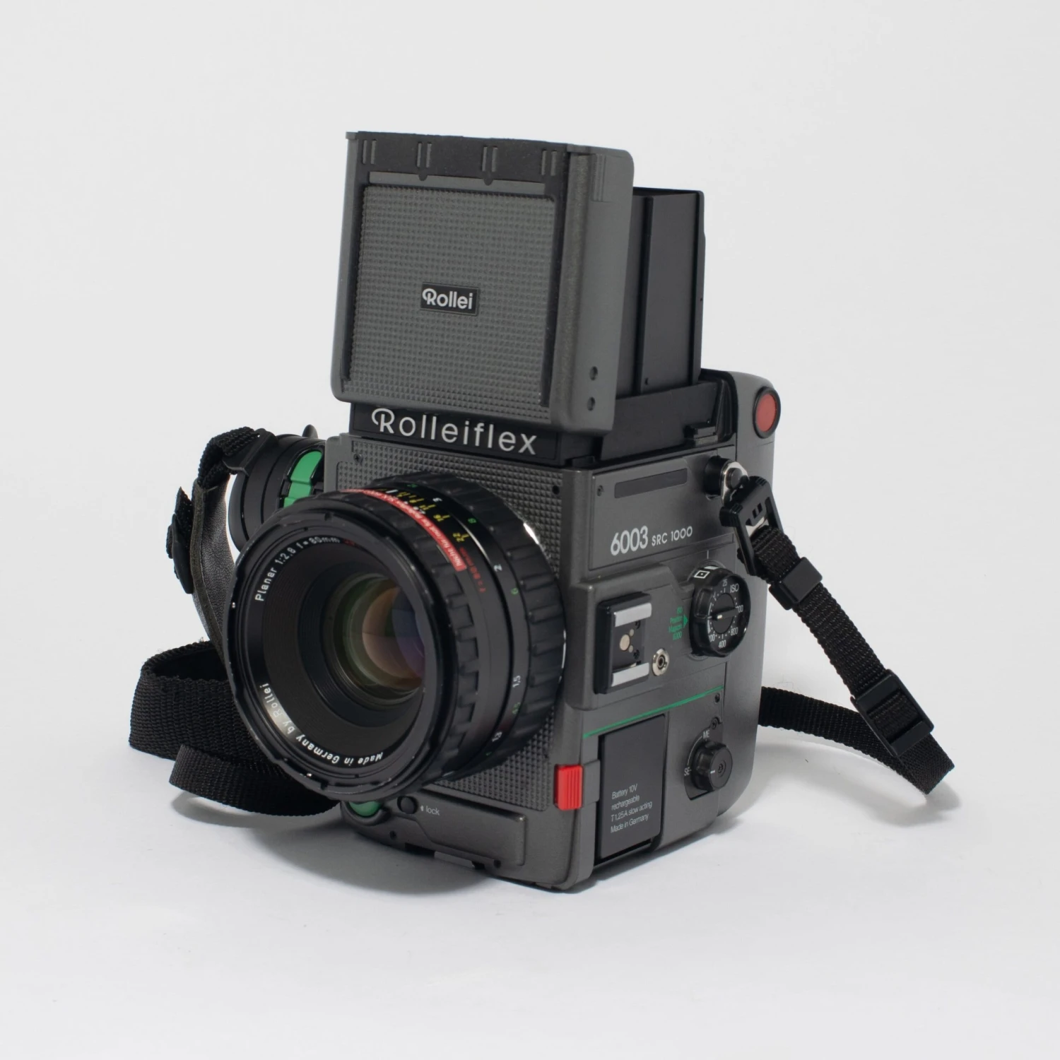 The Rolleiflex 6003 SRC answers the question, “What if a Rolleiflex was more like a Hasselblad?” This is a medium format SLR system. This camera is paired with two lenses (80mm and 150mm). Extra rechargeable battery and charger included in this kit, plus an eye-level prism to switch up the experience with the waist-level viewfinder.
