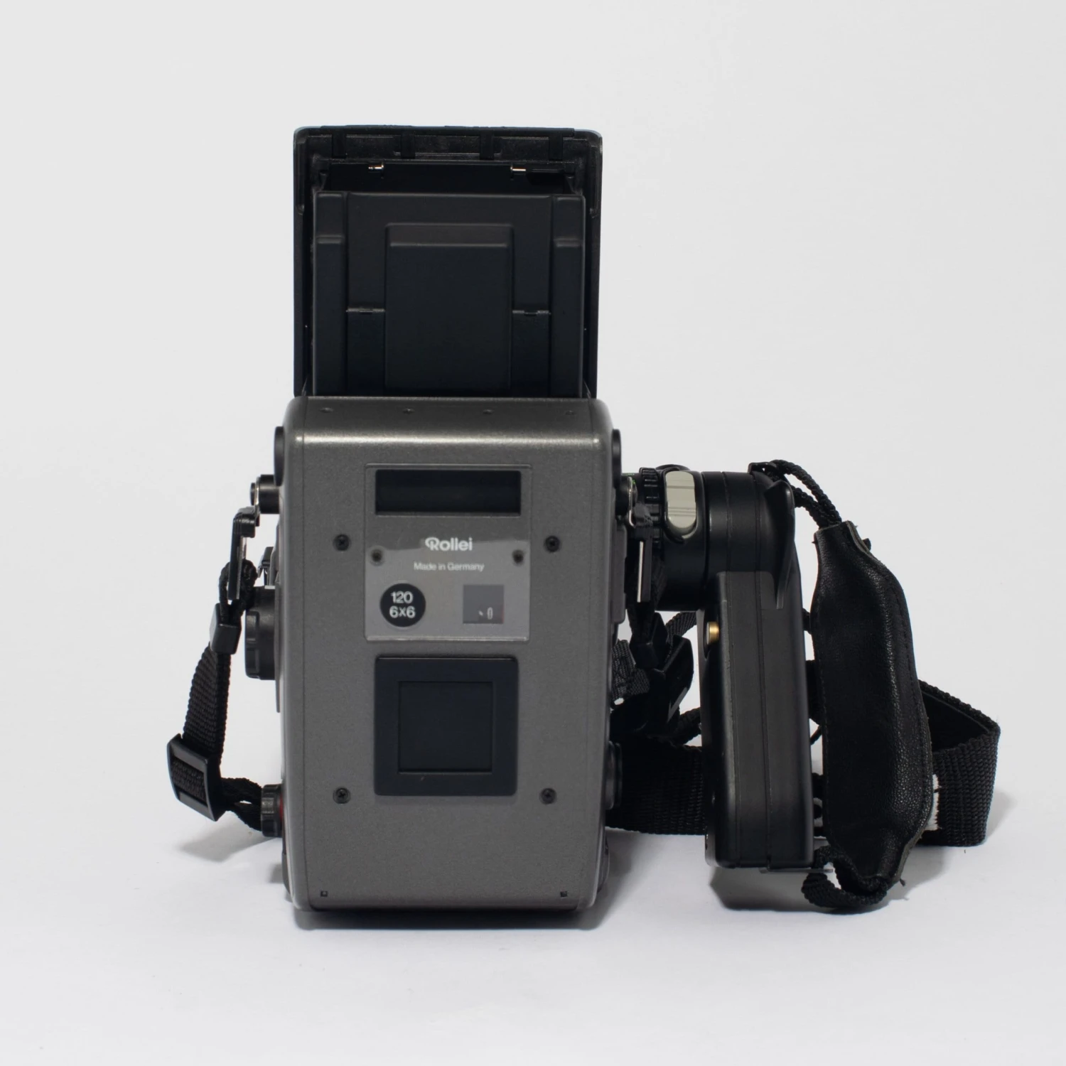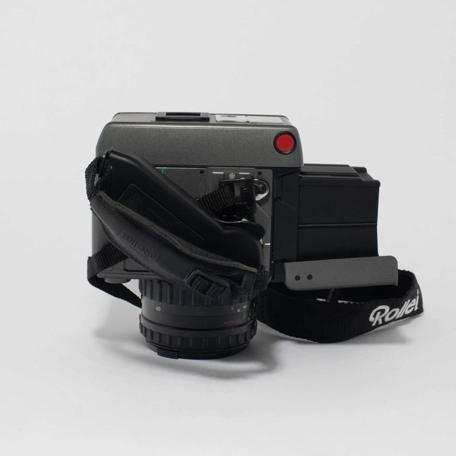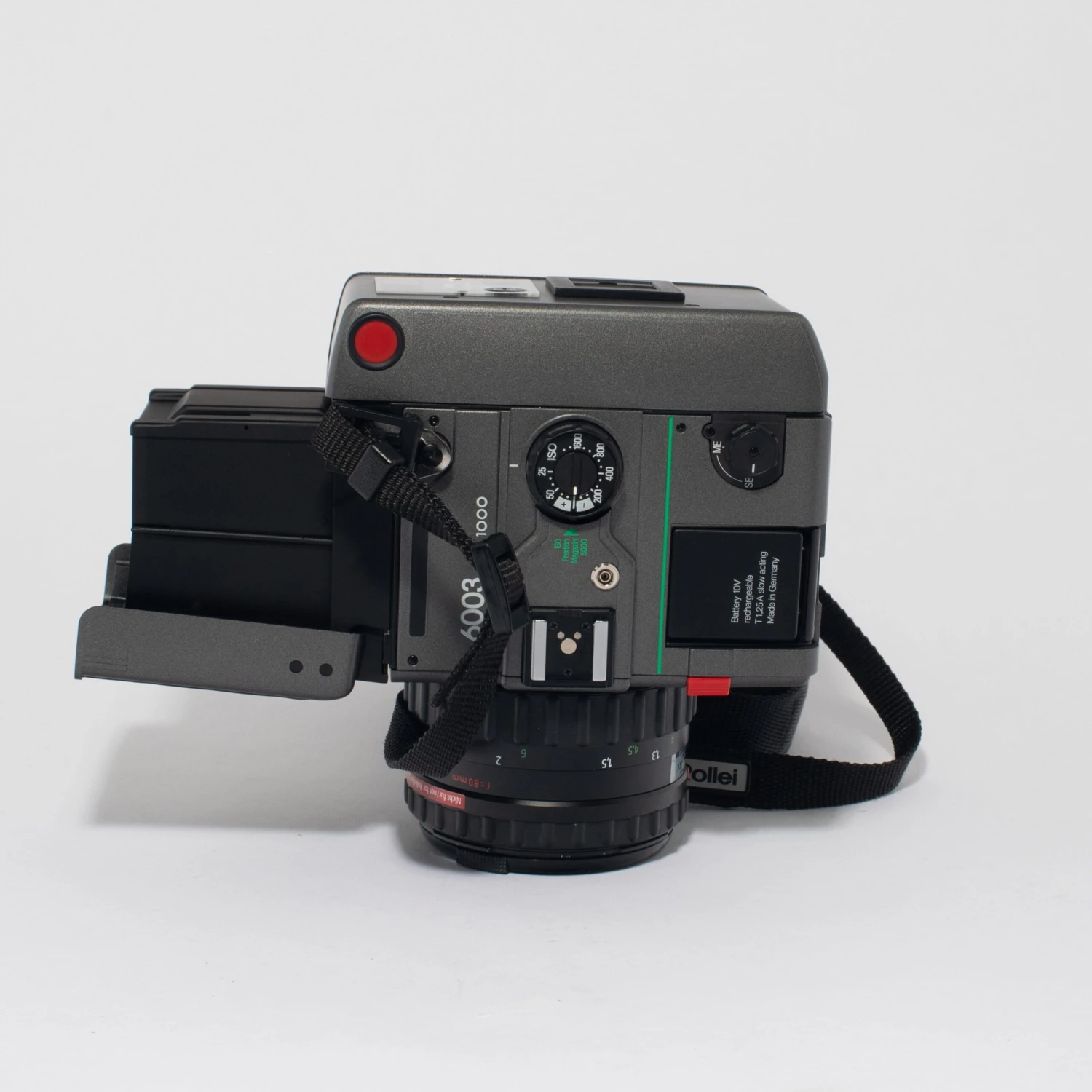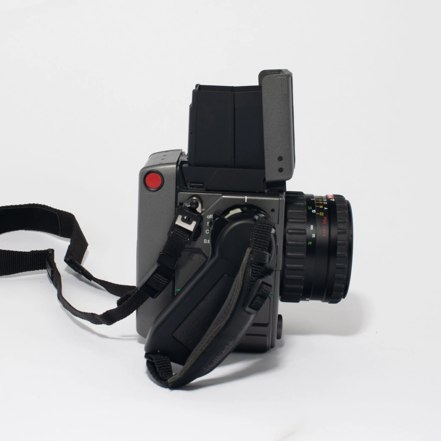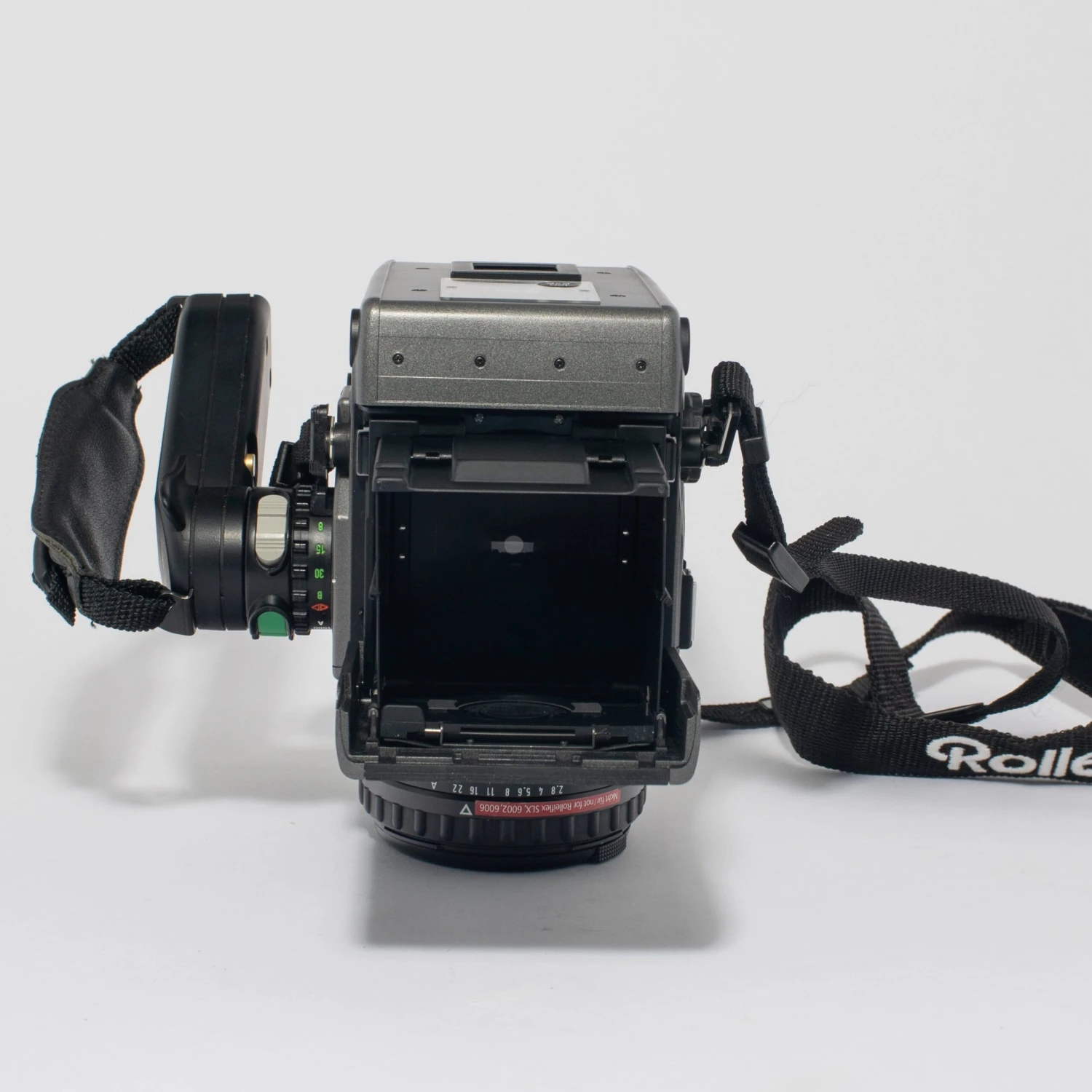 The Rolleiflex 6003 SRC answers the question, “What if a Rolleiflex was more like a Hasselblad?” This is a medium format SLR system. This camera is paired with two lenses (80mm and 150mm). Extra rechargeable battery and charger included in this kit, plus an eye-level prism to switch up the experience with the waist-level viewfinder.