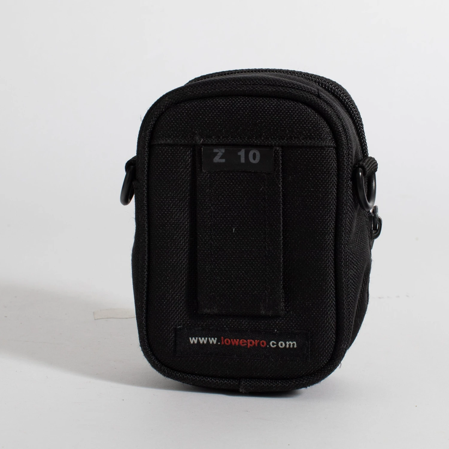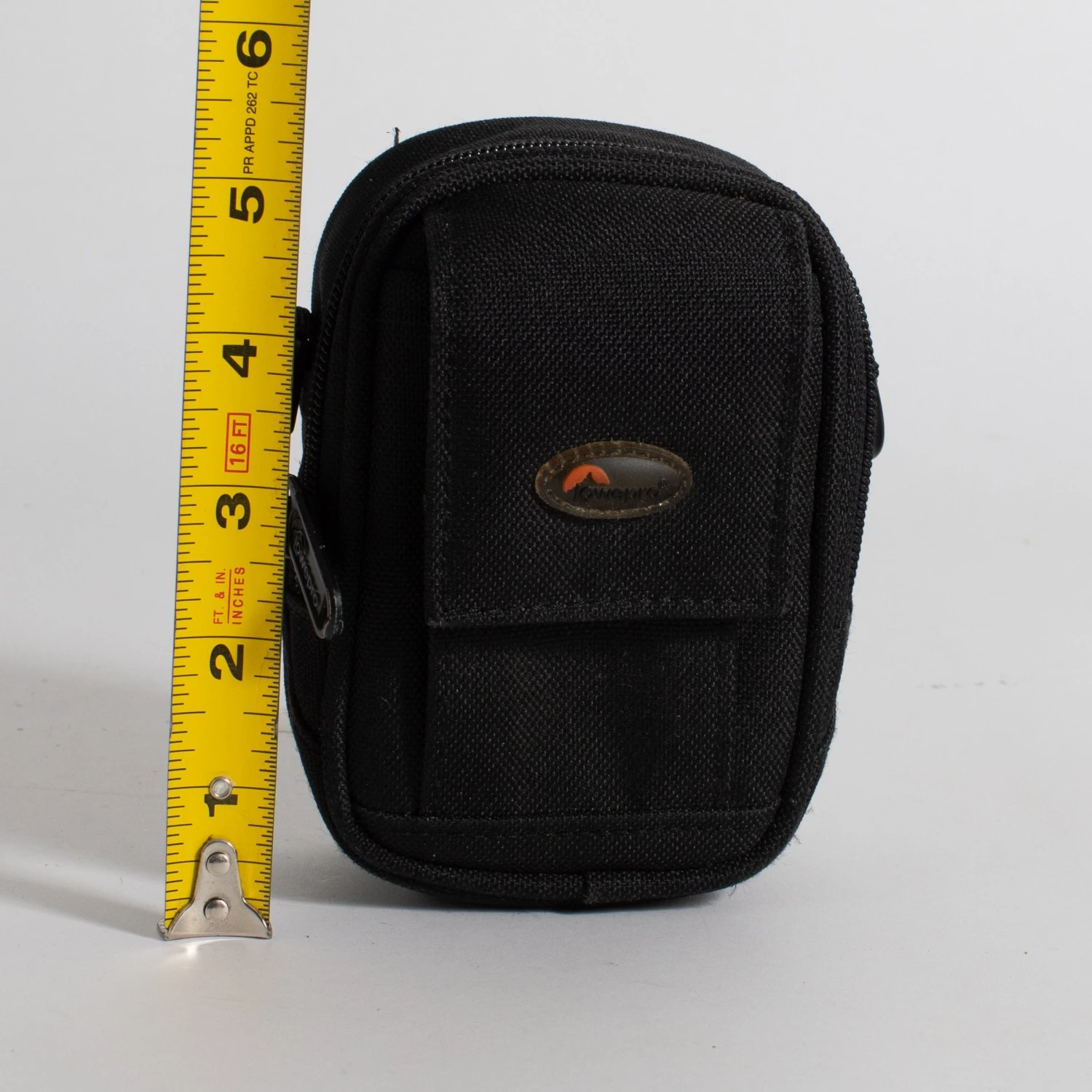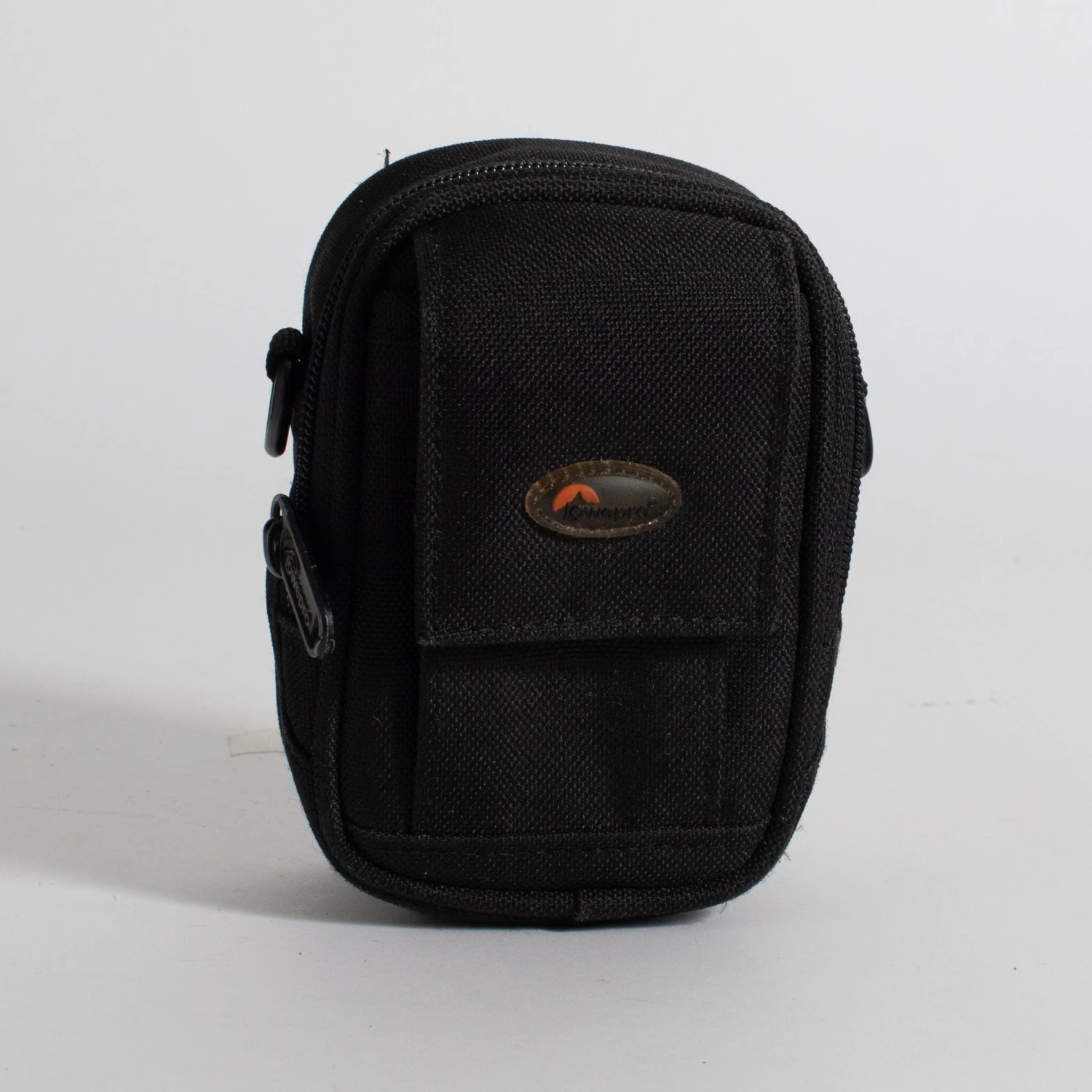 Petite vintage Lowepro point-and-shoot pouch with belt loop on the back and rings for attaching a cross-body strap. Sturdy nylon construction. Would also make a good carrying case for a few rolls of 35mm or medium format film.