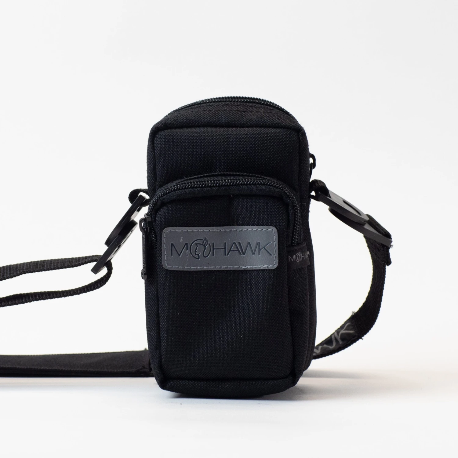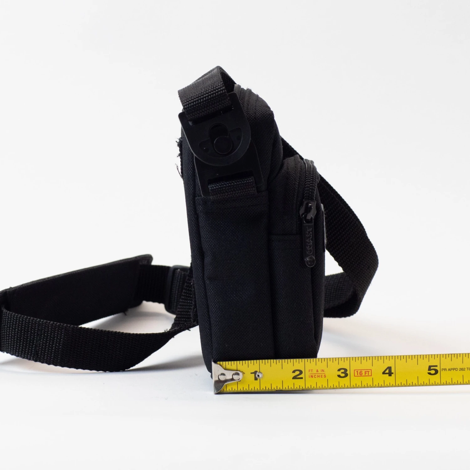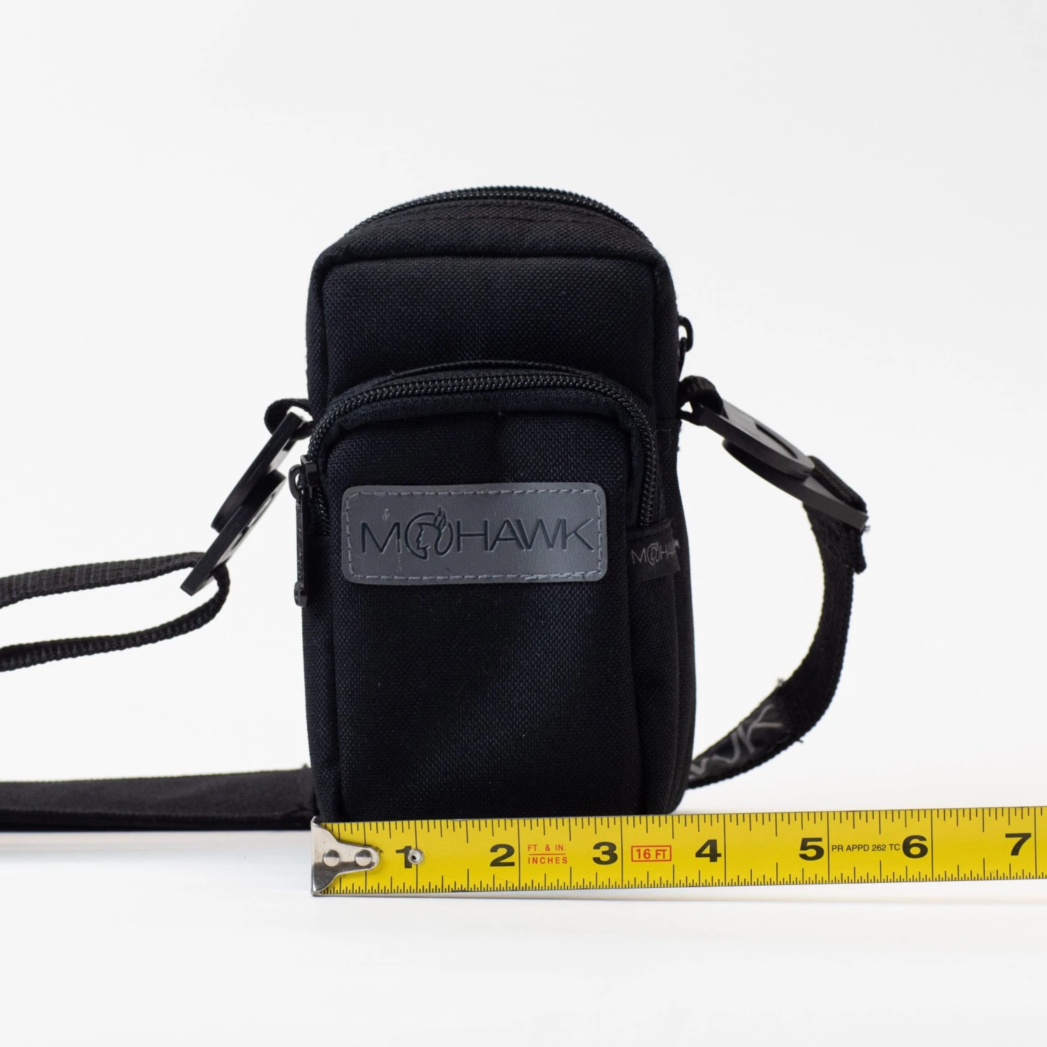 See photos for dimensions; bag is roughly 7″ high and 3 1/2″ wide. There is a second zippered front compartment. We recommend measuring your gear.